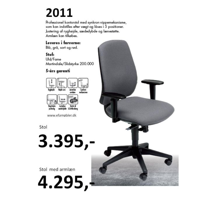Professionel kontorstol med synkron vippemekanisme, som kan indstilles efter vægt og låses i 5 positioner. Justering af højderyg, sæde dybde og lænestøtte. Findes med eller uden armlæn 5 års garanti