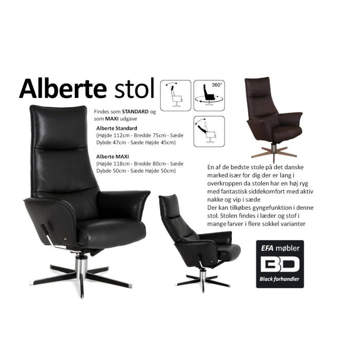 Stolen findes også som en Alberte MAXI udgave hvor bredden er 5 cm bredder 3 cm dybere ryg højden er 5 cm højere Der kan tilkøbes gyngefunktion i denne stol. En super kvalitet i Finsk design. Stolen findes i læder og stof i mange farver i flere sokkel varianter