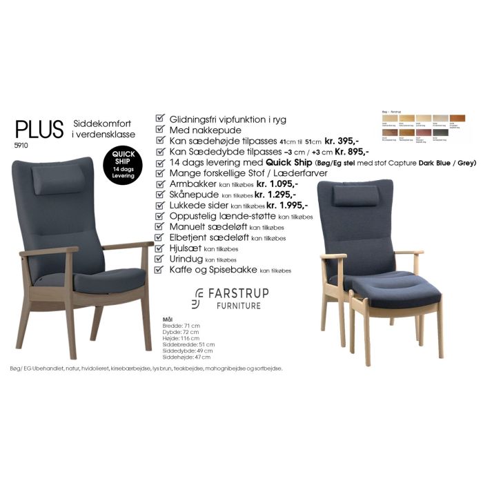 Plus 5910 fra Farstrup er lavet på et stel af massiv bøgetræ eller massiv egtræ. Du kan få tilpasset benhøjden fra 38 cm til 47 cm - ( kr. 395,- ) Du kan tilkøbe armbakker til armlæn ( 1.095,- )Her er et kæmpe række af tilvalgsmuligheder på denne stol der kan tilpassen helt til den enkelte også mange valgmuligheder inden for behandlingsmuligheder på stellet. Det er både muligt at lade det smukke træ stå ubehandlet, vælge en smuk hvidoliering eller flere forskellige bejdse-løsninger. Lænestolen Plus kan bestilles med hurtig levering i Medley 60004 Dark Grey udgaven og hvis du har tid til at vente i mange forskellige farve i kvalitetstekstil eller læder i flere kvaliteter. For at skabe den bedste hvilestol med den absolut bedste siddeoplevelse, er stolen udstyret med en skøn nakkepude. Nakkepuden kan nemt positioneres i den ønskede højde for optimal støtte. Farstrup stræber efter at skabe den perfekte stol til det unikke menneske. Vi deler en fælles kærlighed til træ, håndværk og design, og fører møbelarven fra 1910 videre til fremtidige generationer.