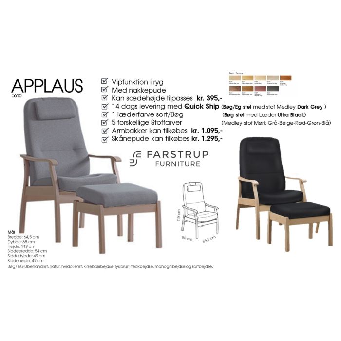 Applaus 5610 fra Farstrup er lavet på et stel af massiv bøgetræ eller massiv egtræ. Du kan få tilpasset benhøjden fra 38 cm til 47 cm - ( kr. 395,- ) Du kan tilkøbe armbakker til armlæn ( 1.095,- )Her er en række valgmuligheder inden for behandlingsmuligheder på stellet. Det er både muligt at lade det smukke træ stå ubehandlet, vælge en smuk hvidoliering eller flere forskellige bejdseløsninger. Lænestolen Applaus kan bestilles i fem forskellige farve i kvalitetstekstil Medley fra Gabriel. I Bøg stel leveres den i sort læder For at skabe den bedste hvilestol med den absolut bedste siddeoplevelse, er stolen udstyret med en skøn nakkepude. Nakkepuden kan nemt positioneres i den ønskede højde for optimal støtte. Farstrup stræber efter at skabe den perfekte stol til det unikke menneske. Vi deler en fælles kærlighed til træ, håndværk og design, og fører møbelarven fra 1910 videre til fremtidige generationer.