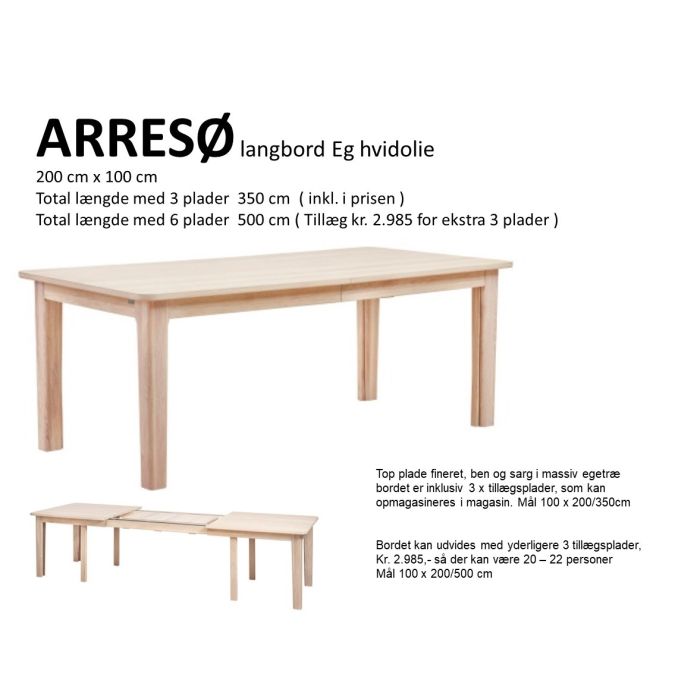 Flot klassisk spisebord i finer og sag kant i massiv eg. Bordet kan blive helt op til 5 meter med alle tillægsplader og plads til 20 - 22 personer. Leveres standard med 3 tillægsplader i eg hvidolie. Mod tillæg kan man få den leveret med hvid laminatoverflade på både bord og tillægsplader.