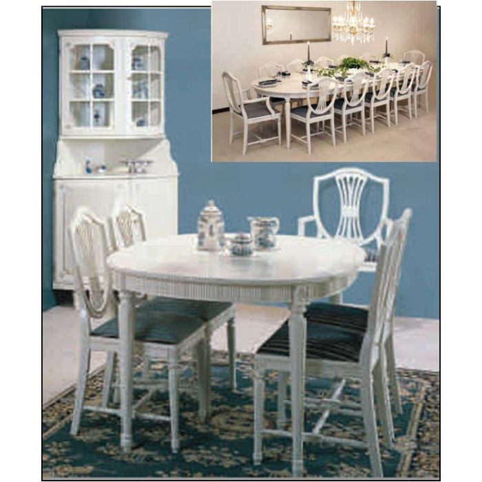Klassisk stort Gustaviransk Spisebord ovalt bord i 142 x 100 cm Bordet har en utrolig glat og flot lak behandling som kun opnås hos de bedste i branchen til at lakerer. Møblet giver den helt rigtige herskabs følelse samtidig med at der er lavet et rigtig godt håndværk. Der kan tilkøbes tiltlægsplader til bordet Bordet er en bestillingsvare