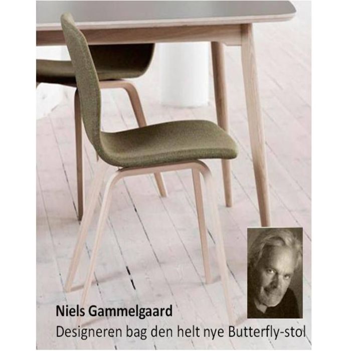 Niels Gammelgaard er designeren bag den helt nye Butterfly-stol i formspændt finer. Siddekomforten er i top, og designet lander smukt i bølgen af nyt, nordisk design med fokus på enkle linjer og gedigne materialer. Butterfly fremstilles i bæredygtige, nordiske træsorter som eg, bøg og ahorn samt sortbejdset eg.