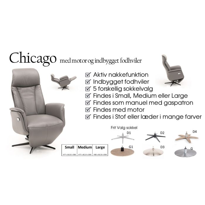 Stol med indbygget fodhvilere med fantastisk siddekomfort, Findes i 3 størrelser, 6 forskellige sokkel-valg samt i læder eller stof i mange farver, Findes i en udgave med indbygget motor - Vælg størrelse og stof eller læder for at finde prisen