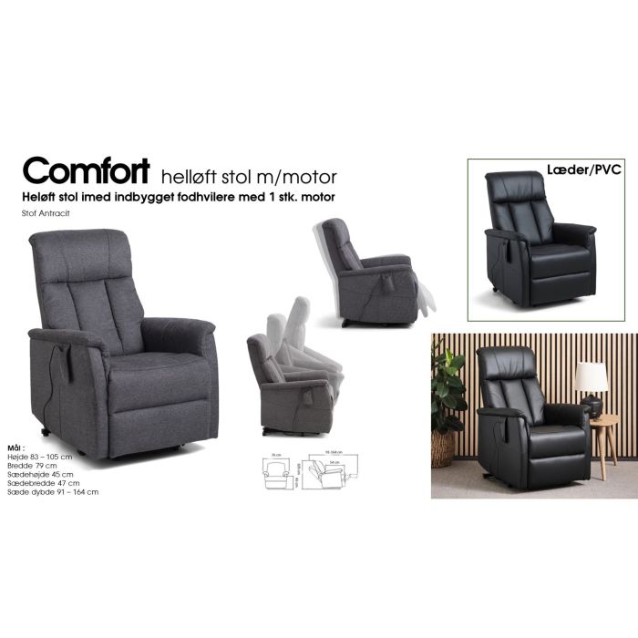 Heløft stol imed indbygget fodhvilere med 1 stk. motor, Findes i antracite stof samt i sort læder/PVC Mål : Højde 83 – 105 cm Bredde 79 cm Sædehøjde 45 cm Sædebredde 47 cm Sæde dybde 91 – 164 cm