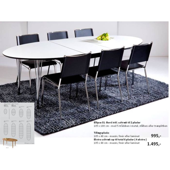 Flot ellipseformet bord fra Haslev møbelfabrik med Laminatplade, Udtræk til 2 plader og 5-trådsben. Laminatpladen kommer som standard med rå birkekrydsfinerkant, men kan også fås med sortbejdset eller hvidmalet kant. Til bordet kan tilkøbes tillægsplader til kr 995,- stk. samt ekstra udtræk helt op til 6 plader med et støtteben på midten kr. 1495,- Mål 180 x 105 Prisen er inkl laminatbordplade, Udtræk til 2 plader og 5-trådsben