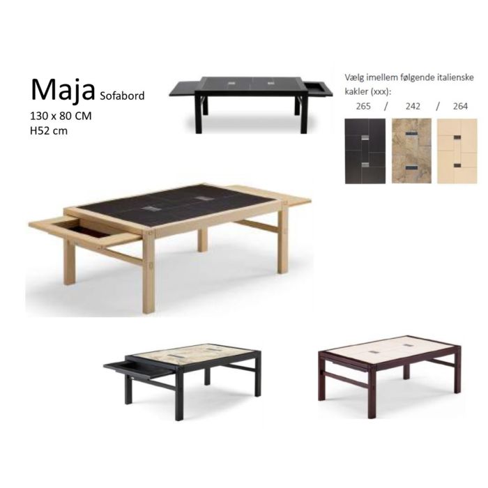 Sofabord 130 x 80 med skuffe og udtrækshylde og kakler, Bordhøjde 52 cm, Der findes 3 forskellige kakkeltyper (lys. sort, Brun ) og 5 forskellige trævarianter