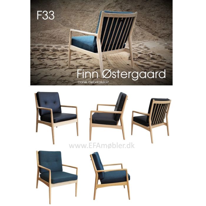 F33 er en elegant og klassisk lounge lænestol i massiv egetræ, som er designet af den danske møbelarkitekt Finn Østergaar