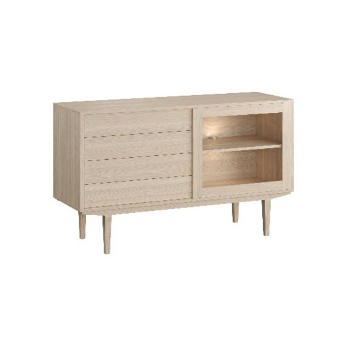 Flot ny let skænk i eg hvidolie med 4 x push up skuffer med soft close samt 1 x skydelåger Finde med fast låge eller med Glas låge hvor der kan lægges Led lys og transformator ( tillæg kr. 495 ). Mål 130 x 80 x 44 cm