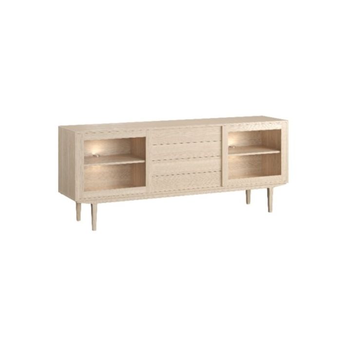 Flot ny let skænk i eg hvidolie med 4 x push up skuffer med soft close samt 2 x skydelåger Finde med fast låge eller med Glas låge hvor der kan lægges Led lys og transformator ( tillæg kr. 495 ). Mål 194 x 80 x 44 cm