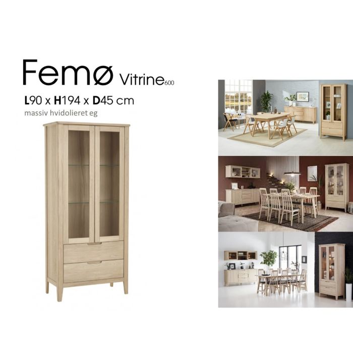 Femø vitrinen er elegant møbel Udført i massiv eg, udstråler robusthed og kvalitet.består 2 store glaslåger med push open, og 2 justerbare glashylder bag. Desuden er der nederst 2 skuffer med softclose og skuffebund beklædt med sort filt. Mål: B90 x D45 x H190 cm.Der kan tilkøbes lys til skabet