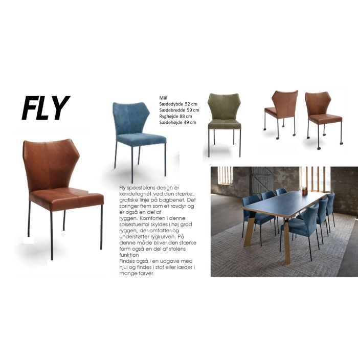Fly spisestolens design er kendetegnet ved den stærke, grafiske linje på bagbenet. Det springer frem som et rovdyr og er også en del af ryggen. Komforten i denne spisestuestol skyldes i høj grad ryggen, der omfatter og understøtter rygkurven. På denne måde bliver den stærke form også en del af stolens funktion