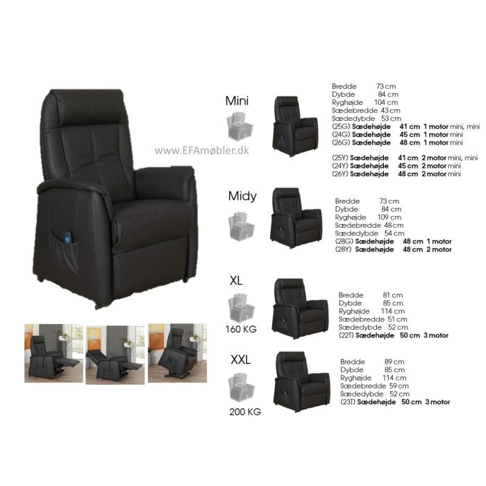 De leveres i 3 sædehøjder så alle kan nå gulvet Du kan tilkøbe en ekstra motor så der er 2 motor i stolen der giver flere funktioner samtidig kr 1295,-