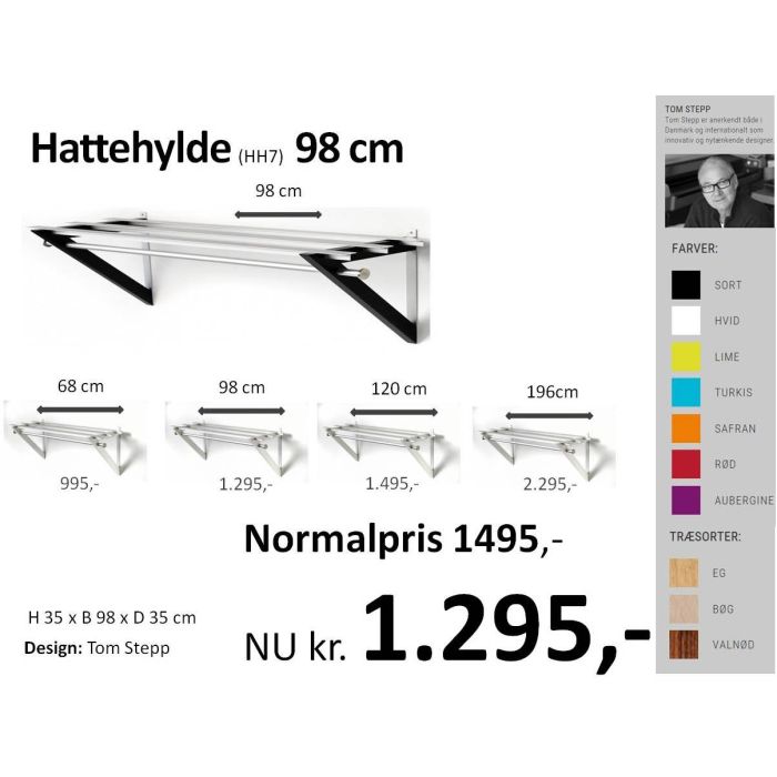 Hattehylde i danske design af Tom Stepp. Findes i smarte farvede kombinationer sammensat med krom metal stænger der samlet giver mange flotte egenpræget kombinations muligheder. Findes også i 68cm, 98 cm, 120 cm og 196 cm længde : Vælg for at finde den korrekte pris. Mål H35 x B98 x D35 cm