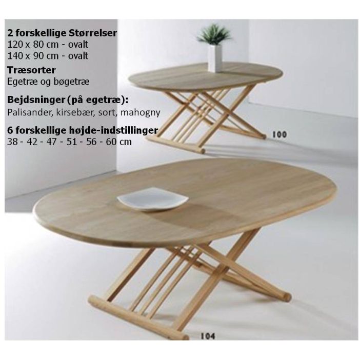 Let stilfuldt sofabord i 2 størrelser hvor understellet kan indstilles i 6 forskellige højde-indstillinger:38 - 42 - 47 - 51 - 56 - 60 cm Findes i 2 træsorter:Egetræ og bøgetræ og kan bejdses (på egetræ):i Palisander, kirsebær, sort og mahogny