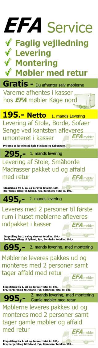 Vi har flere muligheder for at levere møbler med EFA-vogn fra kr. 295 til 995,- på Sjælland, for kr. 100 kr mere på på Fyn, Jylland og brofaste øer. Det afhænger om vi kan aflevere det ved kantstenen eller vi skal bære dem helt ind i din stue, montere møblerne ”ikke montering på vægge”, samt tage dine gamle møbler retur til aflevering til destruktion på kara. Så du kan hos EFA møbler købe nye møbler uden at rører en finger selv.