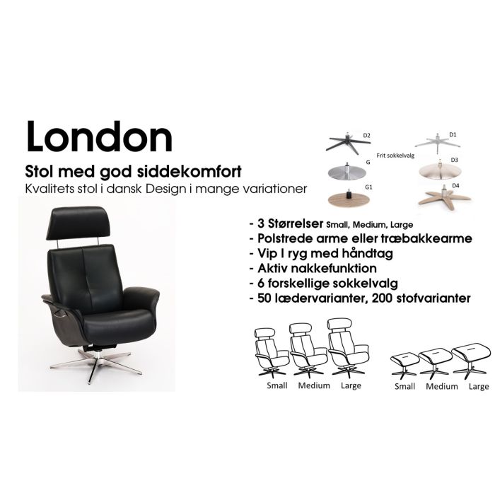 Stilfuld stol med god polstring der støtter for de fleste, Findes i 3 størrelser Small, Medium, Large. Findes i læder eller stof og man kan vælge træ på armene eller overpolstring, Der er 6 stk Sokkelvalg og der er designet en taburet til stolen ( tilkøb) - Der er aktiv nakkefunktion med både nakkeløft og nakke vip samt der er aktiv vip i ryg med let håndtag på siden af stolen. Finde prisen ved at vælge stof eller læder - Prisen er på medium størrelse