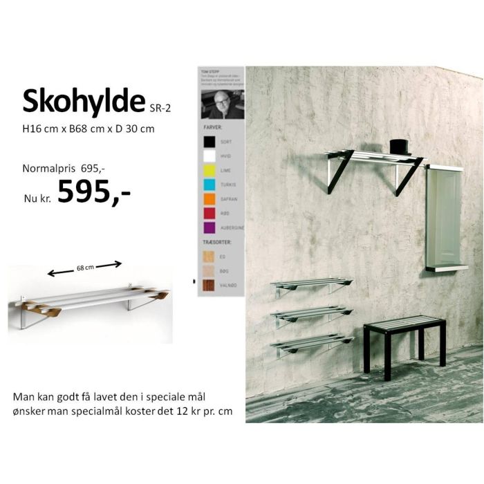 Skohylde til vægmontering i aluminium. Hylden kan både anvendes til sko eller små opbevaringskurve.Findes i mange farver SR-2 Mål H16 cm x B68 cm x D 30 cm