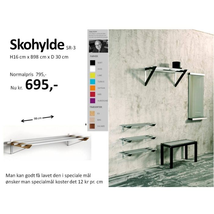 Skohylde til vægmontering i aluminium. Hylden kan både anvendes til sko eller små opbevaringskurve.Findes i mange farver SR-3 Mål H16 cm x B98 cm x D 30 cm