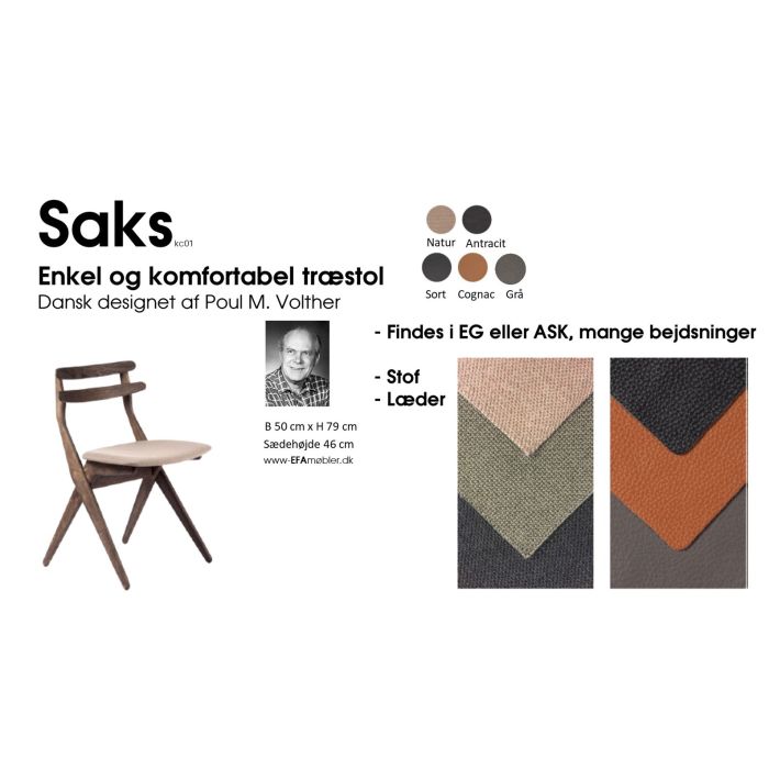 Let flot Saks spisebordsstol, Findes i læder eller stof i flere varianter, Træ kan laves i ask eller i eg i mange bejdsninger