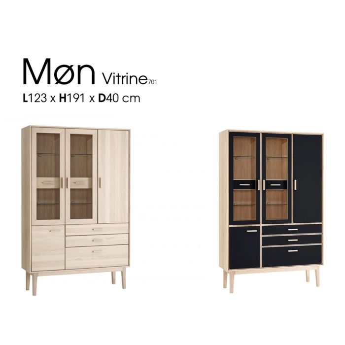 Flot vitrineskab med glashylder og lys der samtidig ser helt let ud hvis man til-vælger lys-parken ( Lysparken 4 lys koster 995,- )