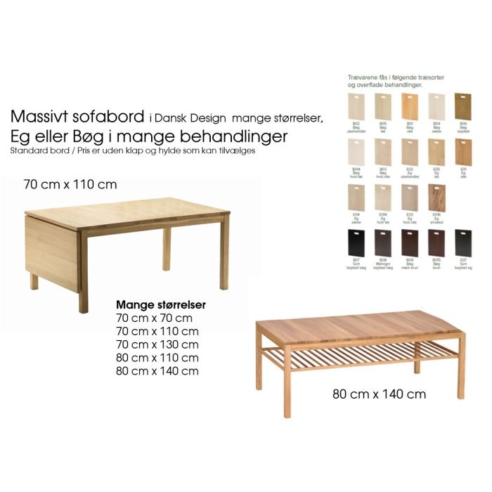 Klassisk sofabord i flotte træstaver - Findes i bøg eller eg i mange behandlinger som sæbe, lak, olie, sort eller mahogny. Den findes i flere variationer som med hylde, med 1 klap, med 2 klapper - det giver mange muligheder for kombinationer. Findes i størrelserne Benhøjde 50 cm