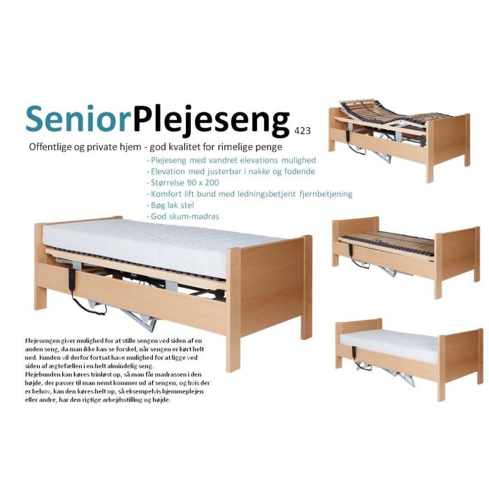 Senior plejeseng til privat eller offentlig brug, der gør det væsentlig nemmere at pleje en person der har svært ved at komme op af sengen selv. sengen er med en special-elevationsbund der kan hæve vandret udover hoved og fodgavl der kan køre som normal elevationsseng.