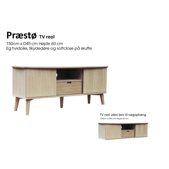 Mål : 150 cm x 45 cm Præstø 150 tv-bord, der både står flot alene eller sammen med resten af den populære Præstø 120 serie.Tv-bordet er fremstillet med 2 skydelåger med 1 justerbarhylde bag hver låge. I midten forefindes 1 hylde og 1 skuffe. Skuffens mål passer til opbevaring af eks. DVD film. Tv-bordet er beregnet til båfr ophæng på væg eller med de medfølgende ben Mål : 150 cm x 45 cm Højde 60 cm Føres i Eg/hvidolie.