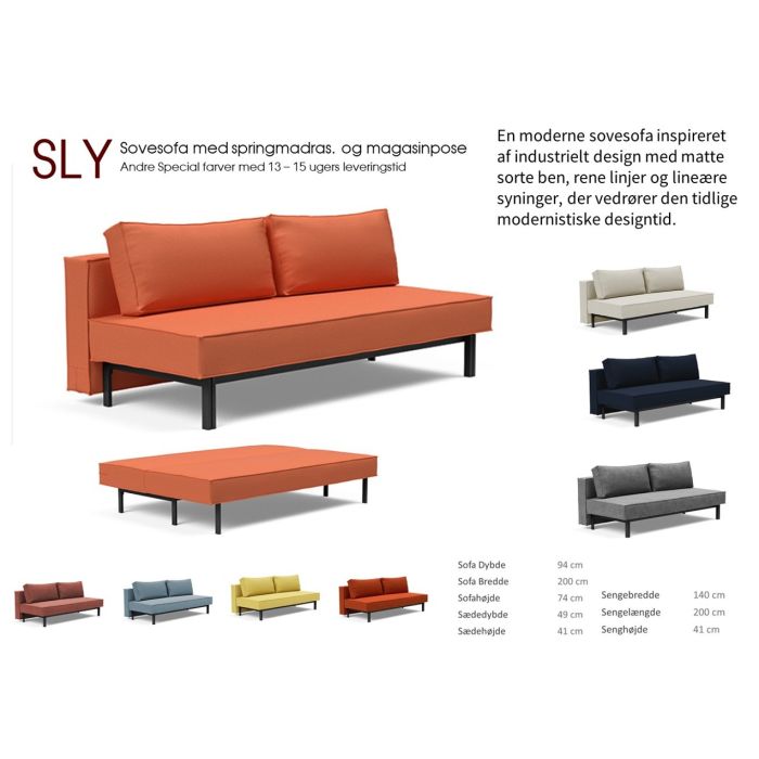 En moderne sovesofa 200 cm x 94 cm inspireret af industrielt design med matte sorte ben, rene linjer og lineære syninger, der vedrører den tidlige modernistiske designtid. Sovemål 140 cm x 200 cm. Findes i mange farver. Der er 4 standard farver med kort leveringstid. Lys Grå, Lys Blå samt gode kampagnepriser og findes i mørke Blå og Mørk Rød med hurtig levering. Vælg farve stof for at finde kampagne prisen