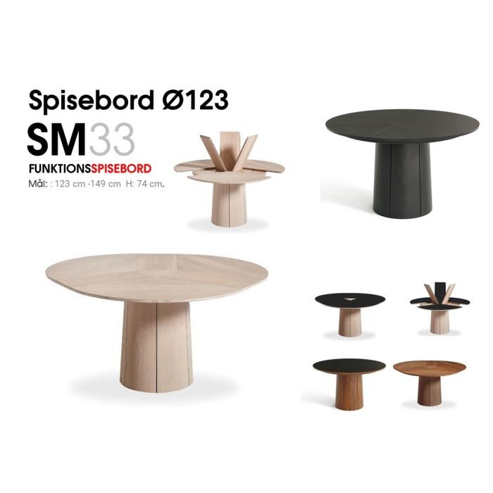 Dette Skovby spisebord SM33WS er et rubost og moderne spisebord. Bordpladen er produceret i mange forskellige kombinationer og i finer, Laminat og massiv. Du får her et spisebord med fokus på den håndværksmæssige detajle og de håndværksmæssige finesser. Dette spisebord er kendt for sit unikke patenterede udvidelsessytem, og der medfølgende tillægsplader, som er integreret i soklen. Soklen afspejler elegance og enkelthed med den lette koniske form, der består af 6 sammenbyggede elementer.