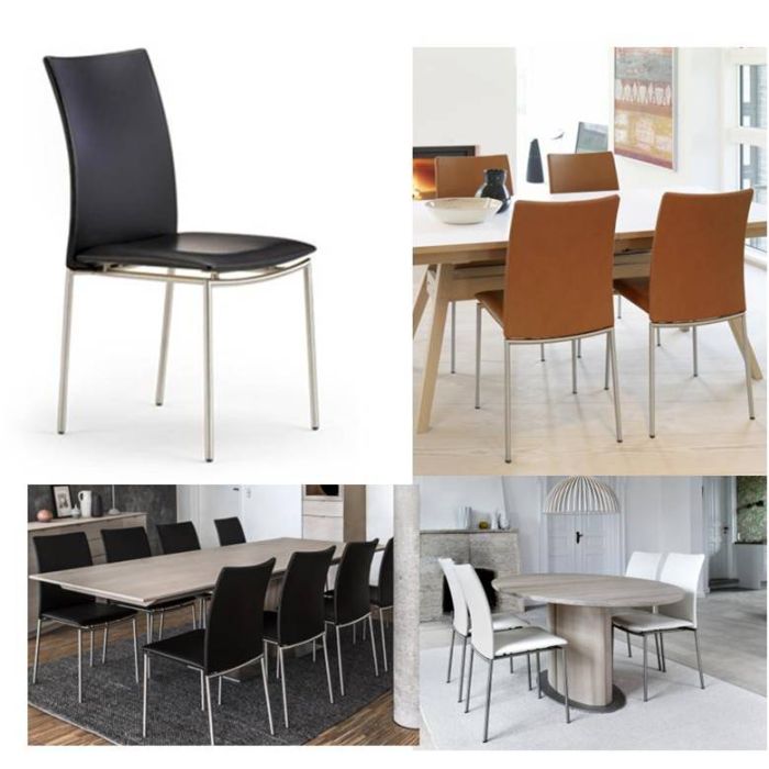 Det børstede stål på EM58 spisestuestol giver en spændende kontrast-effekt til træmøblerne. Vælg mellem utallige lækre og slidstærke betræk i stof og læder til denne spisebordsstol.