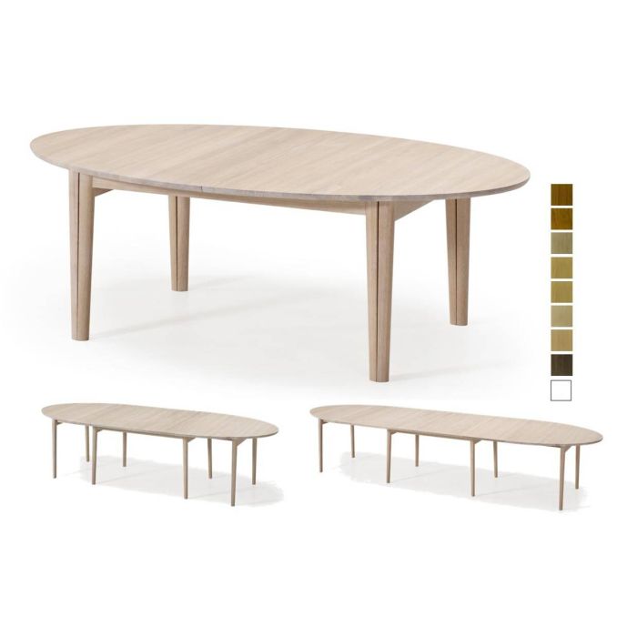 Spisebordets ben står i en lidt skrå vinkel i forhold til hinanden, så der dannes en lille afstand øverst mellem benene - et spændstigt udtryk, der også har en praktisk betydning. Leveres med to tillægsplader, som opbevares i magasin under bordpladen. Derudover kan der købes to ekstra tillægsplader.Fuldt udtrukket giver spisebordet plads til 16 personer.Spisebordet fås også med bordplade i hvid laminat og med understel i hvidolieret eg eller sort wengé. Findes i massiv og finer