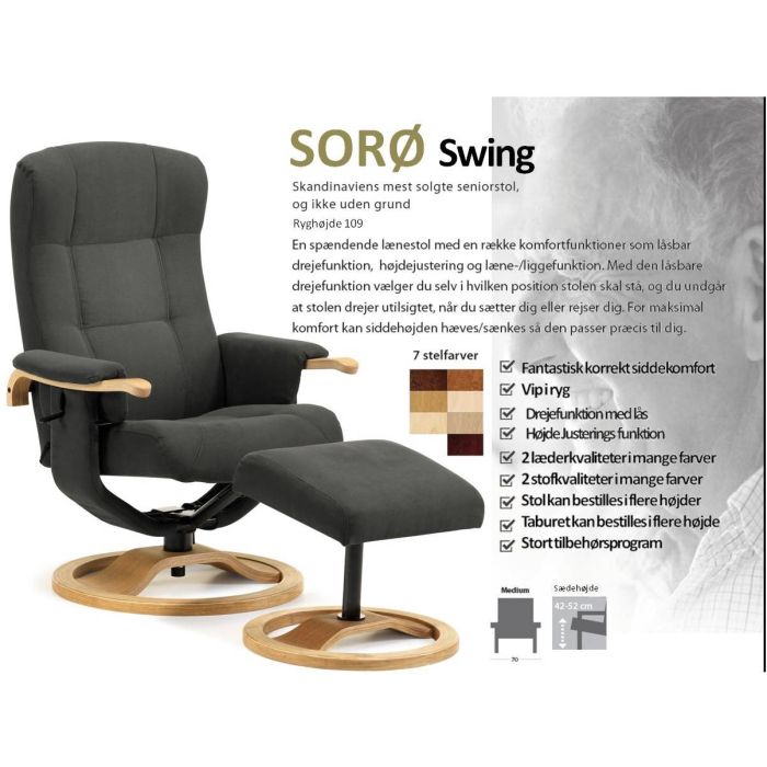 Hvilestol med god korrekt siddekomfort med højdejustering på drejesokkel, hvor du på en stilleskrue under soklen kan justere højden på stolen. Du kan vælges med mange forskellige slags stof og læder. På denne Sorø stol er der mulighed for at låse drejefunktionen så den ikke drejer fra dig når du rejser dig op fra stolen. Findes i mange træsorter på sokkel Fodskammel købes separat.