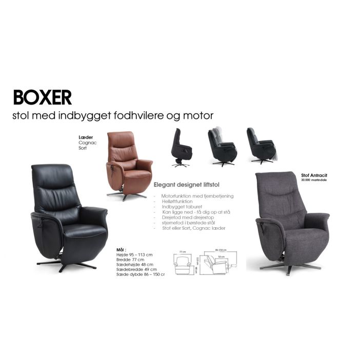 - Stof eller Sort læder/PVC samt LUX Cognac læder overalt