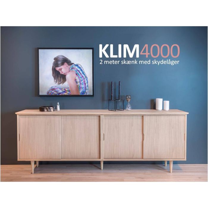 Skænk i fra Klim med skydelåger, Findes i mange størrelser og indretninger. Findes i Bøg,Eg, Bejdse i Mahogni eller sort Sort i Olie, Sæbe eller lak behandlinger. Mål 200cm x 75cm x 40 cm dybde