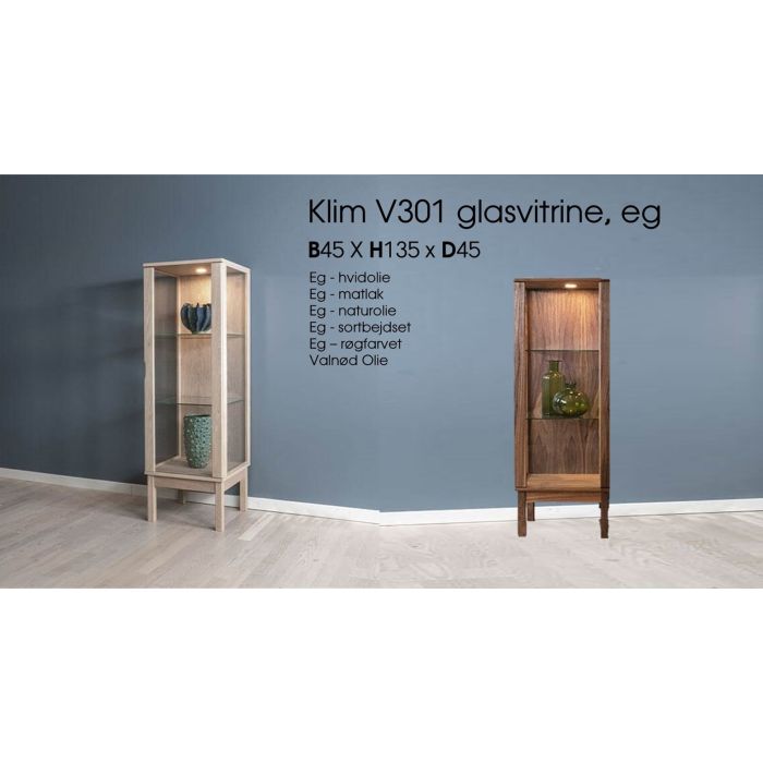 Det smukke vitrineskab fra Klim Furniture har glas i siderne, som gør møblet ideelt til at udstille dit porcelæn, glas m.m. Vitrineskabet leveres med LED-lys som tændes/slukkes og dæmpes via en medfølgende knap til transformeren.