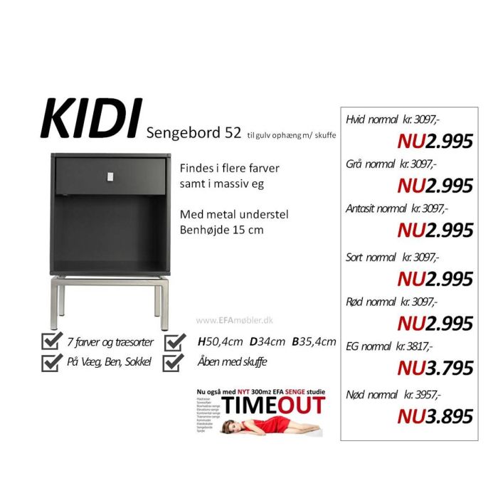Sengebord med en lille Skuffe med 15 cm metalunderstel Findes i Bøg lak, Eg klar olie, Sort, hvid, Rød, Grå, Antracit lak samt i massiv eg i ubhandlet eller eg hvidolie, samt i Nøddetræ