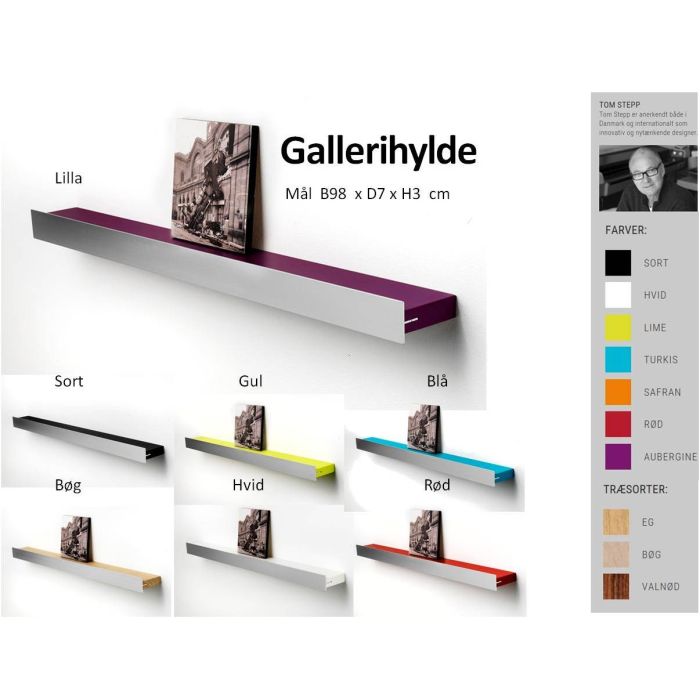 Stilfuld Gallerihylde i flot stil design af Tom Stepp. Perfekt gave til det stilfulde hjem. Findes i mange farver og træsorter Mål H3 cm x B98 cm x D7 cm Væg farve eller træsort for at finde prisen